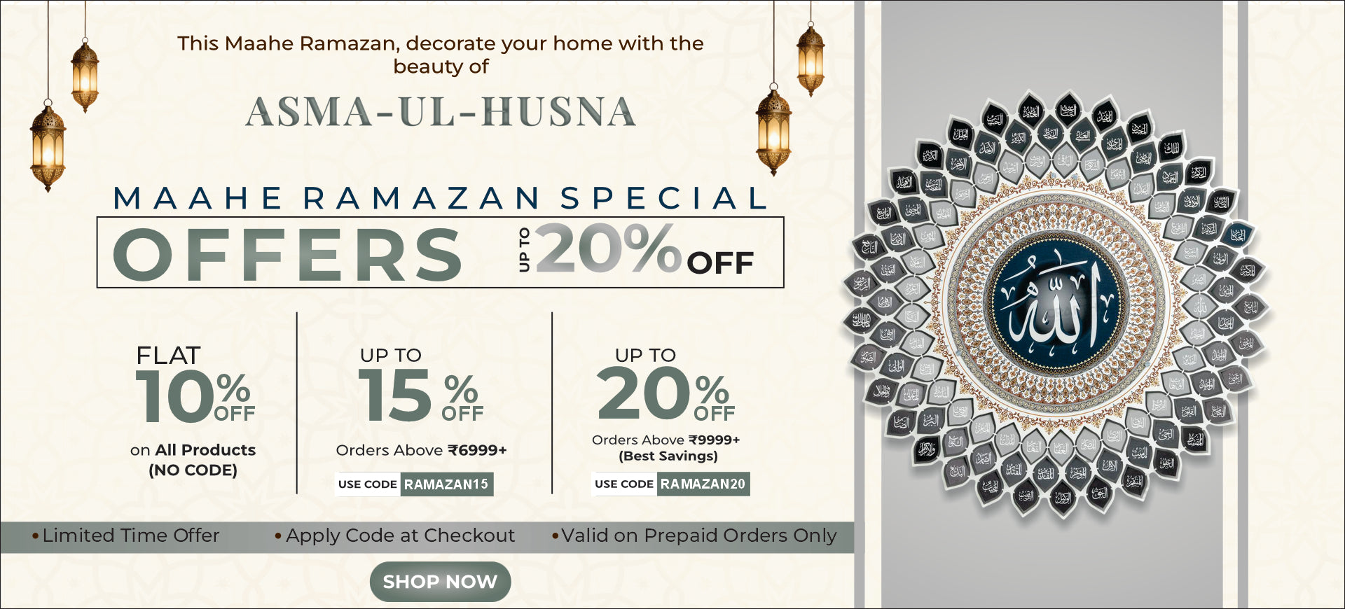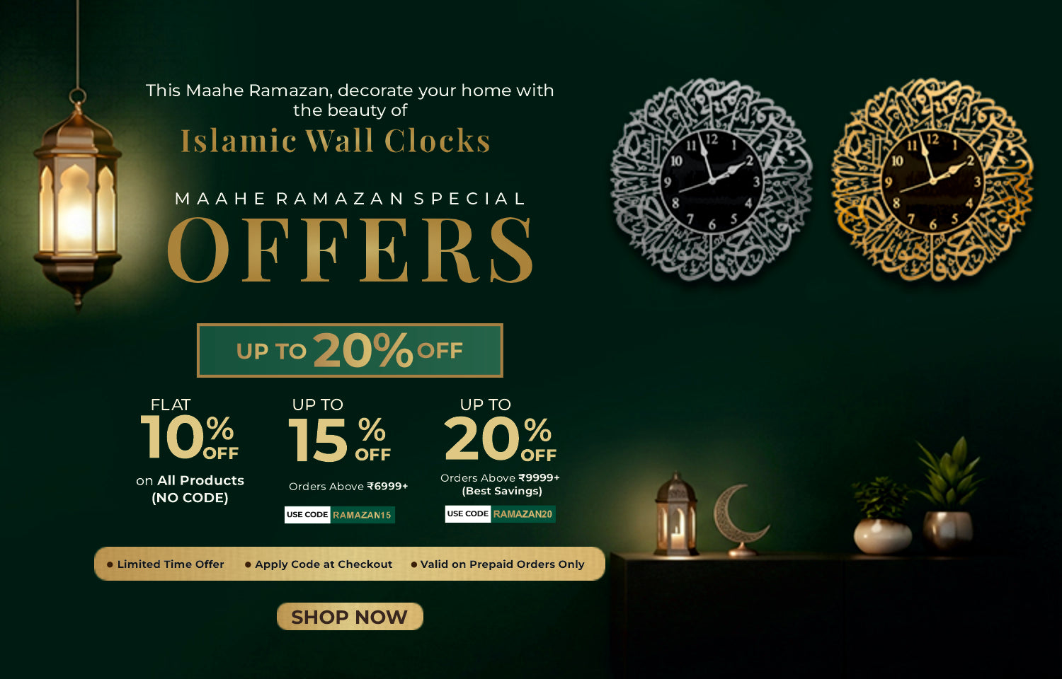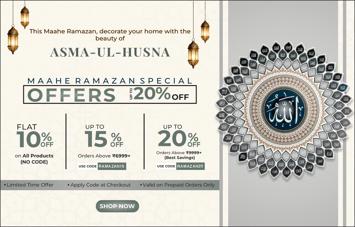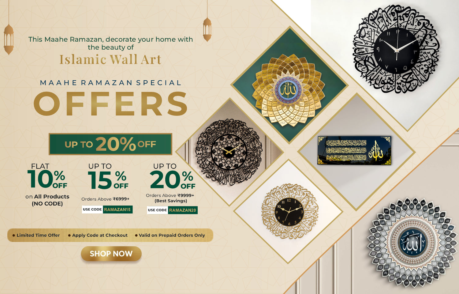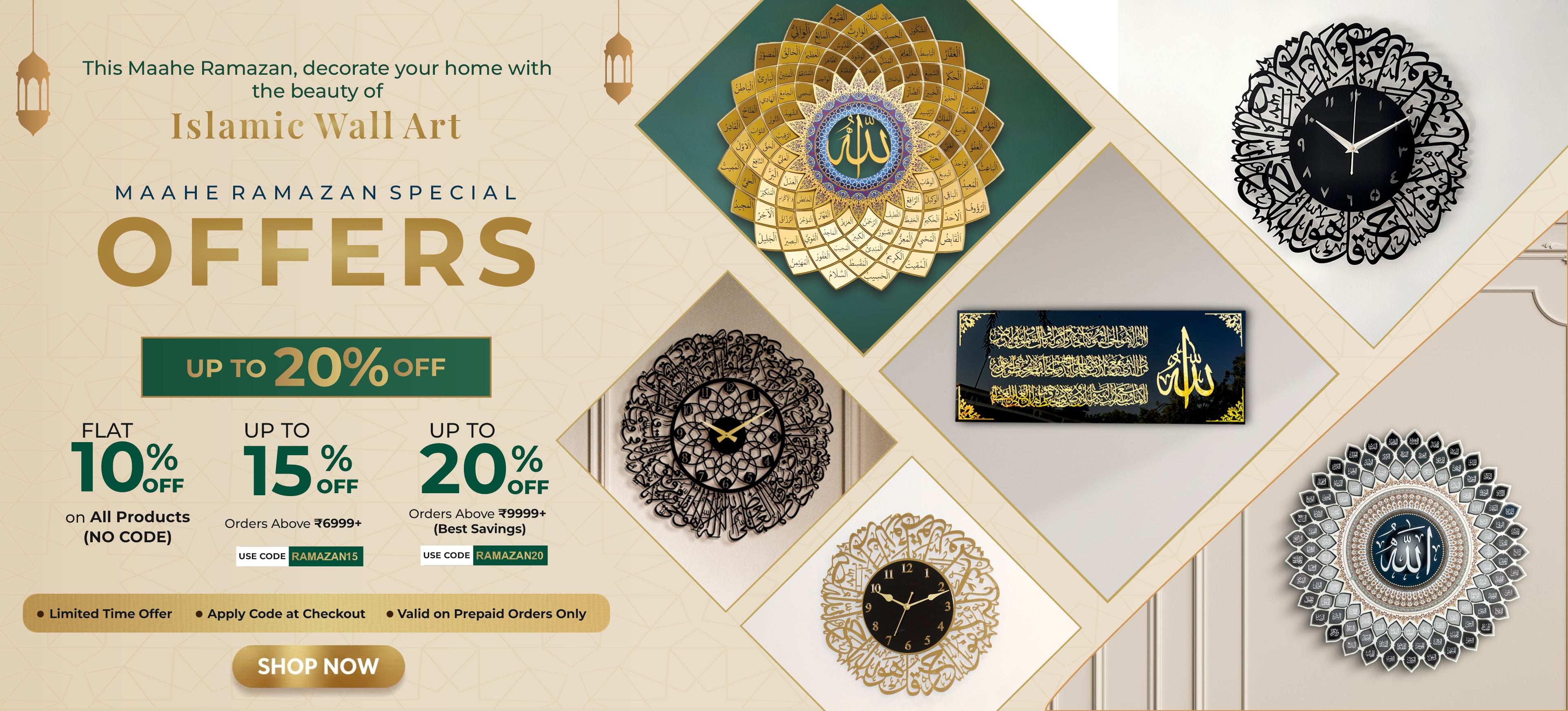Explore our premium Islamic wall art, modern acrylic designs, and exquisite clocks, crafted to bring timeless beauty and spiritual charm to your home. From Islamic calligraphy frames to luxury canvas prints & modern wall clocks—find the perfect decor to elevate your space with elegance, inspire your soul, and transform your surroundings.